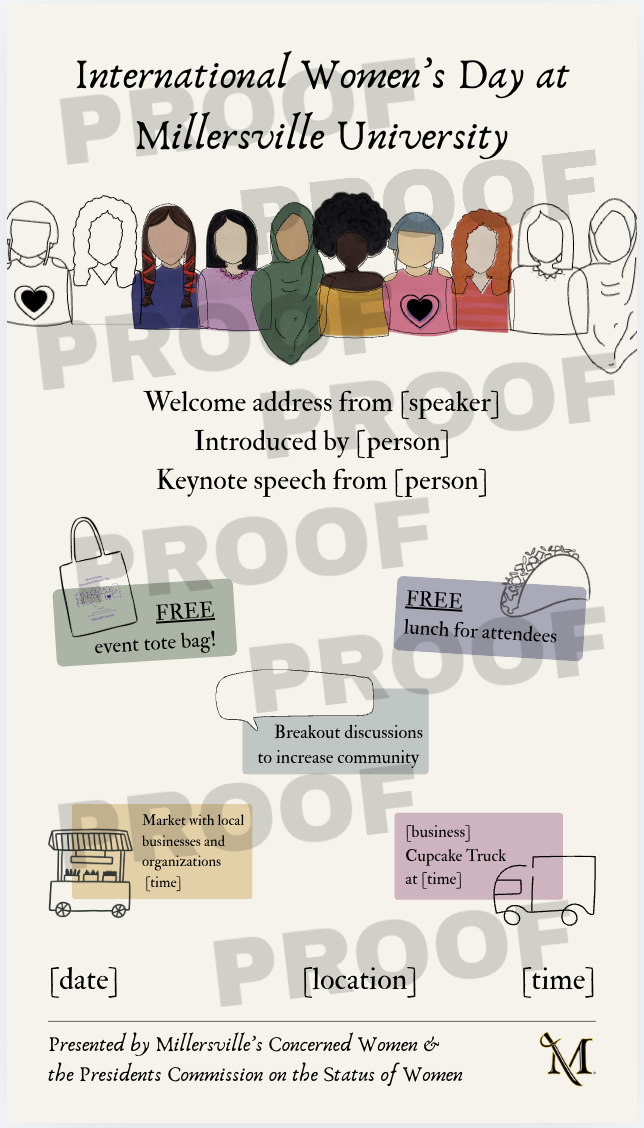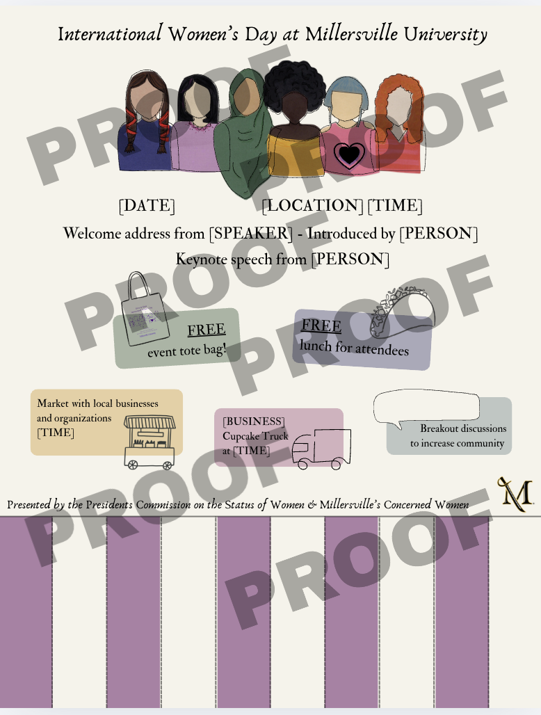 This project was a lot of fun! The co-chairs of the President’s Commission on the Status of Women and I worked together to develop an understanding of their needs and requirements for this event. With little to no attendance at the IWD events in years past, the clients were looking to lean into a welcoming, authentic, and colorful vibe to attract students, faculty, and staff. Through scheduled calls and inpromptu dinner meetings we decided to focus on using shades of Millersville University’s gold, and IWD’s purple as our main color theme and use inclusive language throughtout all communications.